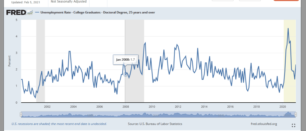 In my industry, higher ed, the year was brutal: 650,000 jobs lost, or 13% of employees. People with PhDs are smart and hard-working enough to earn an advanced degree, flexible enough and willing to sacrifice to move around the country for a job, with sometimes pathological dedication to hard work, and the ability to delay gratification for years, forgoing earnings in their 20s and early 30s while they complete their training. Whatever other problems they have, they aren’t people who display the lack of motivation Ramsey thinks is endemic to the poor. As the graph below from the Federal Reserve Bank of St. Louis shows, unemployment has spiked among people with PhDs–just one fraction of the group represented in the 13% decline in higher ed jobs.